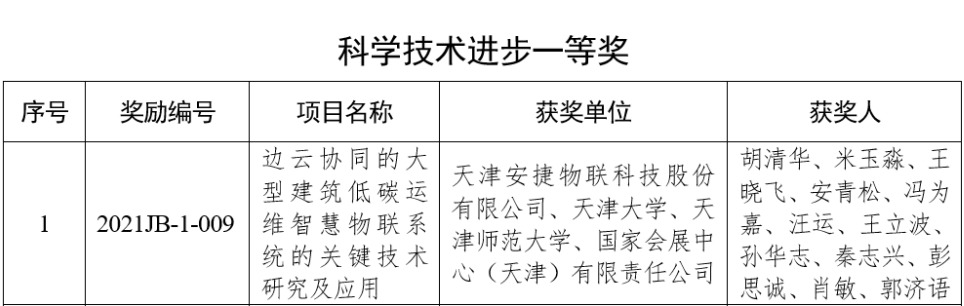 日前,2021年天津市科学技术奖获奖名单公布,由天津huatihui物联科技股份有限公司联合天津大学、天津师范大学、国家会展中心(天津)有限责任公司申报的《边云协同的大型建筑低碳运维智慧物联系统的关键技术研究及应用》项目,荣获“天津市科学技术进步一等奖”。